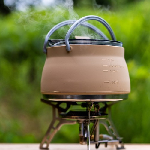 내열성: 캠핑 주전자는 물을 끓이거나 음료를 만들기 위해 높은 내열성을 가지고 있습니다. 이는 캠핑 지역에서 화로나 캠핑 스토브 등을 사용해 불 위에서 사용할 수 있도록 만들어져 있습니다.